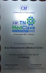 Sri Ramachandra Medical Centre was awarded CII TN’s MedClave Honours 2022 for the Specialty Cardiology at Hotel Crowne Plaza, Chennai on 19th November, 2022.
