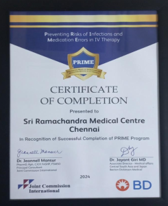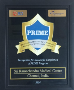 Sri Ramachandra Medical Centre was awarded for successful completion of PRIME program (Preventing Risk of Infections and Medication Errors in IV therapy) – 6 months program involving a team of 35 nurses in collaboration with Becton and Dickinson (BD) during the valedictory ceremony on 6th June, 2024.